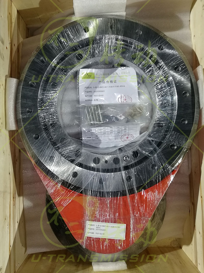 S-III-O-0431三系列重載外齒全防護(hù)特殊法蘭齒輪式回轉(zhuǎn)驅(qū)動(dòng),客戶用在工業(yè)往復(fù)運(yùn)動(dòng)領(lǐng)域,直齒式回轉(zhuǎn)驅(qū)動(dòng)豎直安裝使用,受安裝空間限制直齒驅(qū)動(dòng)的直徑不能太大,這一制約因素限定了直齒驅(qū)動(dòng)的減速比不能做大,但是輸出扭矩要求又很高,這種情況下只能選用很大的電機(jī)來滿足總輸出扭矩,最終設(shè)計(jì)的適配法蘭非常大,法蘭過大干涉內(nèi)圈固定螺栓的安裝,為此不二傳動(dòng)的設(shè)計(jì)團(tuán)隊(duì)為客戶設(shè)計(jì)了一個(gè)特殊的高大的適配法蘭,配合合理的安裝步驟,完全解決了客戶的問題,大扭矩輸入,適配法蘭也同樣做了特殊設(shè)計(jì),確保穩(wěn)定,可靠。