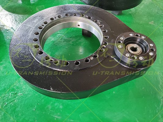 根據(jù)上述工況回轉(zhuǎn)支承按照大傾覆力矩設(shè)計(jì),采用小游隙高精度設(shè)計(jì),確保高轉(zhuǎn)速下回轉(zhuǎn)驅(qū)動(dòng)旋轉(zhuǎn)平穩(wěn),齒采用表面感應(yīng)淬火,保證大的輸出扭矩及耐磨性能,齒芯部柔軟,具有很好的耐沖擊性,適合大慣量,大沖擊載荷。殼體采用球墨鑄鐵QT450-10鑄造而成,機(jī)械性能優(yōu)良,穩(wěn)定性高,耐磨抗震,殼體表面噴塑處理,防銹美觀,噴塑前進(jìn)行磷化處理,提高防銹能力及噴塑的附著力。輸入端法蘭按照客戶馬達(dá)輸出端尺寸設(shè)計(jì)制造,客戶可以直接連接馬達(dá),給客戶提供很大的便利,減少連接部件,增加穩(wěn)定性,節(jié)約空間,縮小整機(jī)體積,降低陳本。