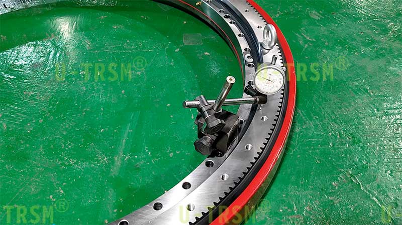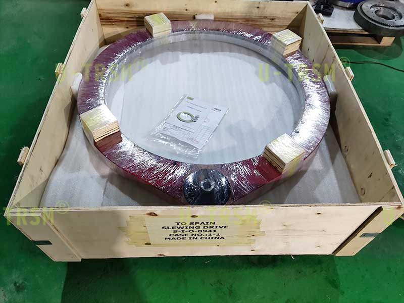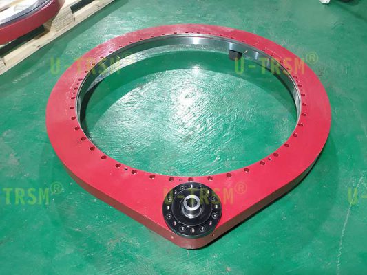這是一款輕系列的直齒回轉(zhuǎn)驅(qū)動(dòng)產(chǎn)品,適合客戶低載荷的工況。小模數(shù),在直徑一定的情況下,模數(shù)越小齒的數(shù)量就越多,小齒輪相同,模數(shù)小,減速比就大,大減速比適合客戶的低轉(zhuǎn)速?;剞D(zhuǎn)中心直徑941mm,滿足了客戶對(duì)大尺寸工件穩(wěn)定支承旋轉(zhuǎn)的需求。