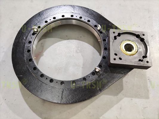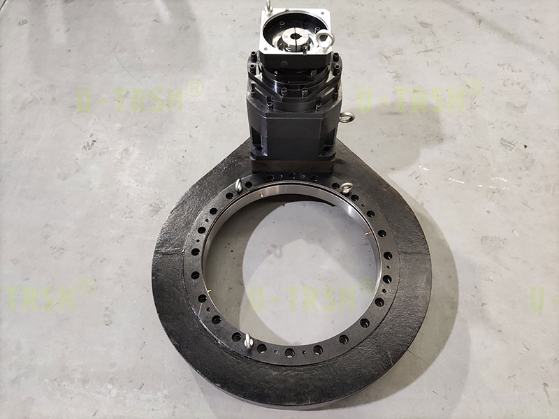 S-III-O-0655 配套三級減速機的精密磨齒回轉(zhuǎn)驅(qū)動應(yīng)用在智能制造車間的設(shè)備上,客戶使用普通電機帶動回轉(zhuǎn)驅(qū)動旋轉(zhuǎn),到達指定位置后停止,要求回轉(zhuǎn)驅(qū)動輸出轉(zhuǎn)速非常低,到達指定位置后轉(zhuǎn)臺不能有較大晃動。