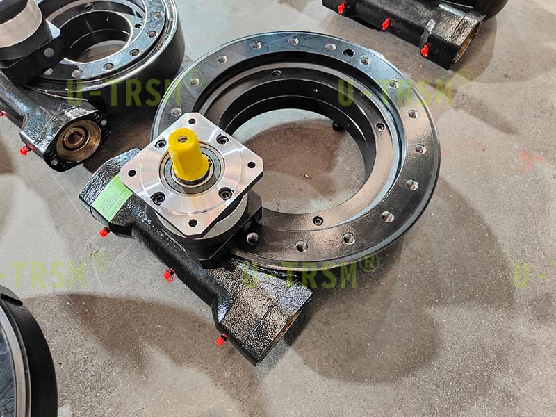 精密14寸回轉(zhuǎn)驅(qū)動(dòng)配套行星減速機(jī)應(yīng)用在特重設(shè)備上,使用特點(diǎn)是轉(zhuǎn)速特別低,需要大的減速比,輸出扭矩要求小,要求精度較高,并且底座和轉(zhuǎn)臺(tái)外側(cè)都沒有空間安裝減速機(jī)和電機(jī),電機(jī)和減速機(jī)只能安裝在底座和轉(zhuǎn)臺(tái)中間的夾縫中。